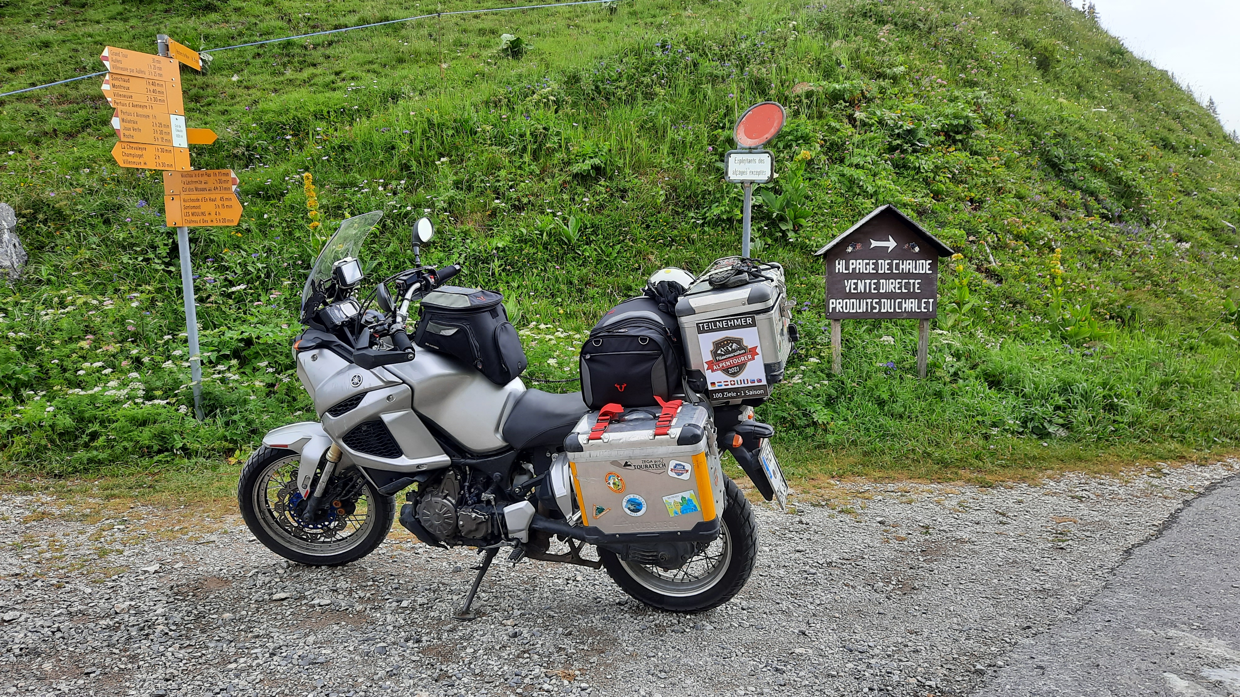 Der Chaude-Pass ist nur noch von Villeneuve aus erreichbar, wo die asphaltierte Anfahrt nahe des Genfer Sees beginnt. Die Strecke windet sich an der Tinière entlang bis hinauf zur Scheitelhöhe, die knapp über der Baumgrenze liegt und bei klarer Sicht einen tollen Rundum-Blick über das zu Füßen liegende Gewässer bietet. Vom Scheitel geht die Fahrt nur noch wenige hundert Meter bis zur Alp Chaude hinab. Die vorhandenen Wege zum Col de Sonloup und Col de Jaman sind schon länger gesperrt bzw. nicht befahrbar. |
