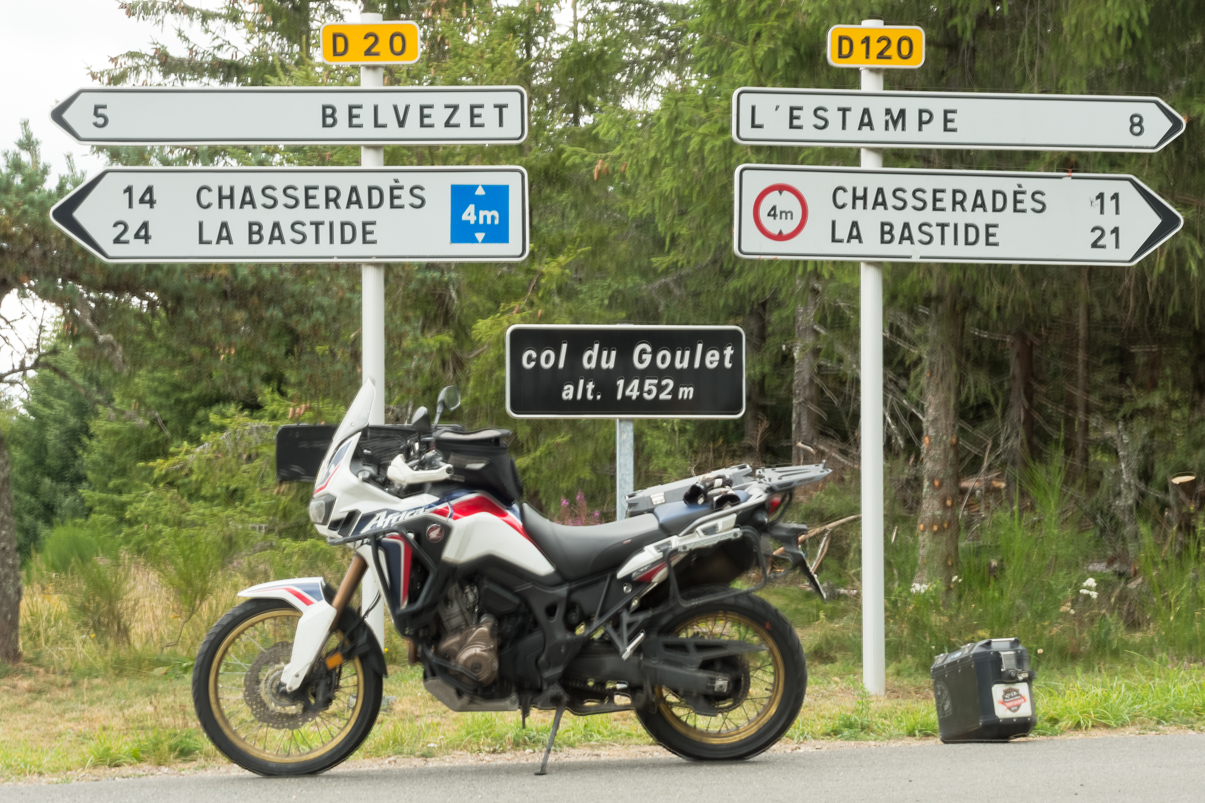 Die Südrampe des Col du Goulet beginnt am nördlichen Rande des Nationalparks Cevennen. Wer noch älteres Kartenmaterial nutzt, sollte sich von der Beschilderung nicht irritieren lassen. Die Gemeinde hieß Le Bleymard, bis sie zum 1. Januar 2017 mit den Gemeinden Bagnols-les-Bains, Belvezet, Chasseradès, Mas-d’Orcières und Saint-Julien-du-Tournel zu einer neuen Kommune namens Mont Lozère et Goulet zusammengeschlossen wurde. Die Straße befindet sich in gutem Zustand mit ordentlichen Belag. Allerdings hat sie nur wenige Kurven zu bieten und verläuft recht unspektakulär durch dichten Tannenwald. Erst an der Passhöhe im Wald wird die Straße deutlich enger und der Belag schlechter. Nach einigen engen Kehren verlässt die Straße den Wald und verläuft aussichtsreich durch Weideflächen und Bergwiesen Richtung Chasserades aus. |