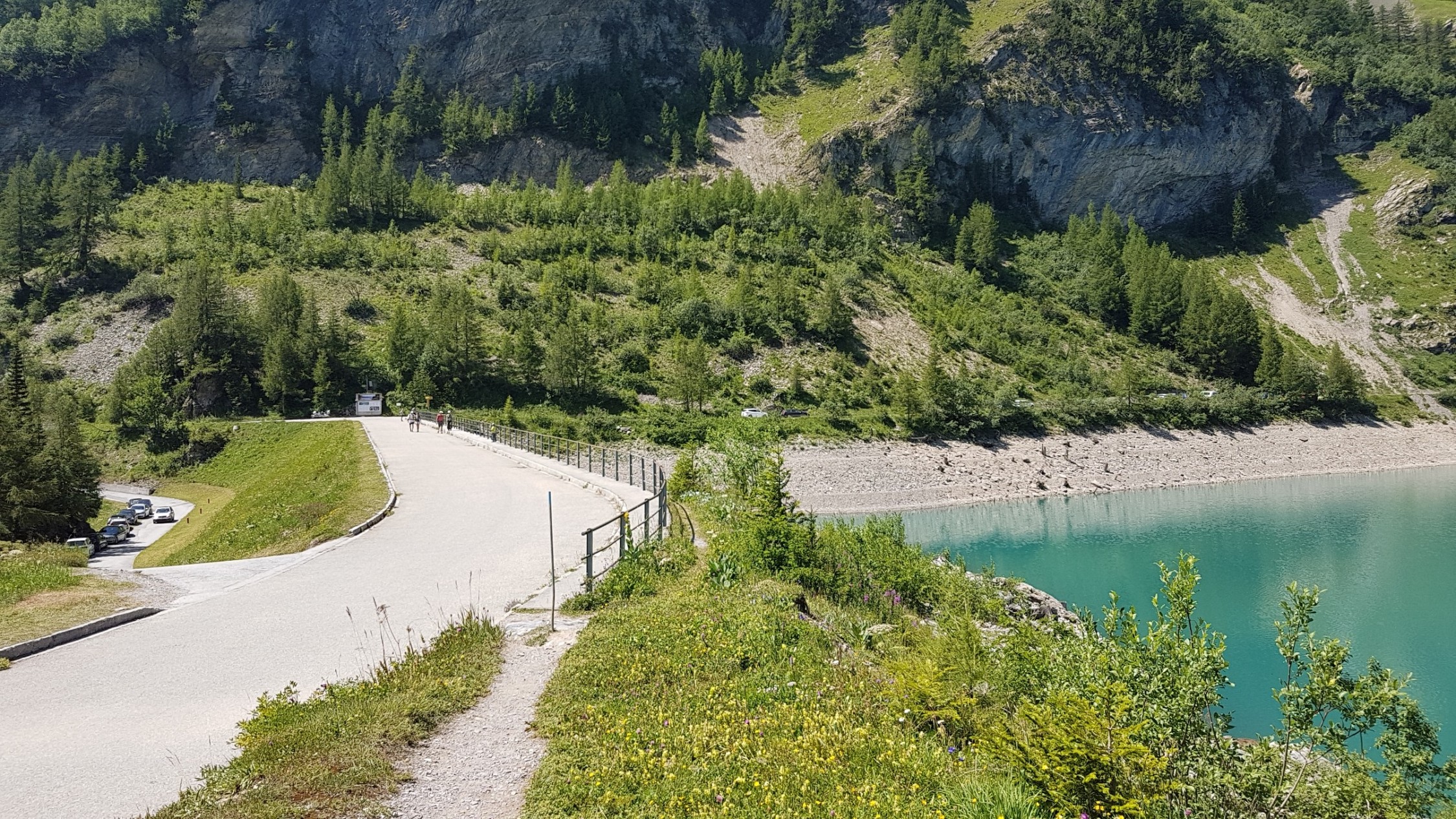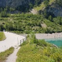 Egal ob von Sion oder Sierre aus angefahren, die Strecke zu diesem Bergsee windet sich herrlich kurvenreich aus dem Rhônetal in die Berge. Im oberen Abschnitt gibt es zwei längere, schmale Tunnel. Hier muss auf eventuellen Gegenverkehr geachtet werden: Der Postbus, der ebenfalls bis an die Staumauer verkehrt, hat stets Vorrang. An der Staumauer gibt es Gastronomie. Wer sich angesichts der landschaftlichen Schönheit nicht die Wanderschuhe anziehen mag, ist selber schuld. Eine Runde um den See dauert ca. 2 Stunden – mit Traumpanoramen über dem türkisfarbenen Gewässer. |