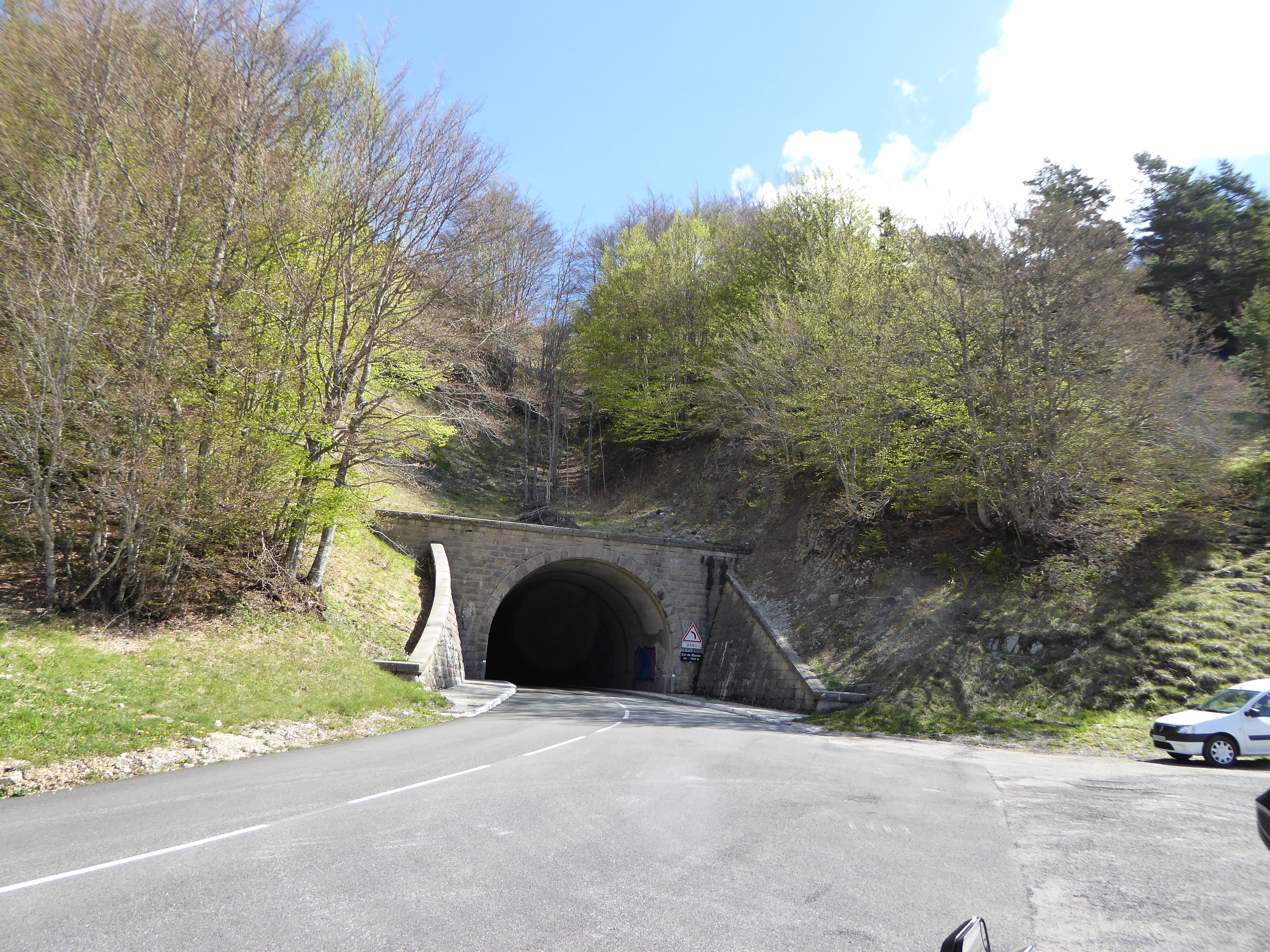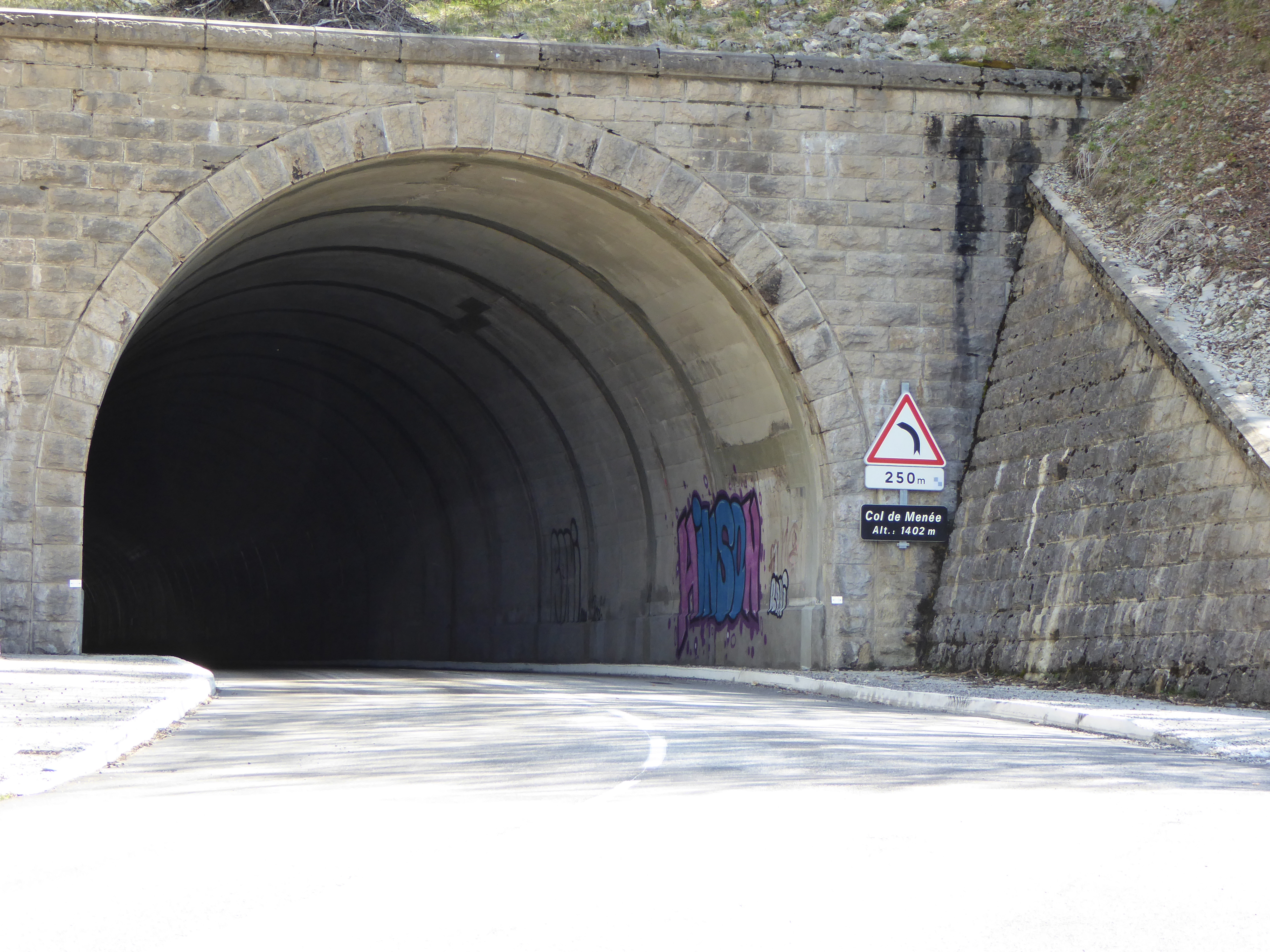 Der Col de Meneé ist ein Teilstück der Straße D120/D7, die in Süd-Nord-Richtung von Châtillon en Diois bis nach Clelles führt. Gelegentlich ist im Internet oder auch anderer Lektüre die Rede davon ist, dass dieser Pass sehr schwierig zu fahren sei. Dem ist allerdings nicht so. Wer ein wenig Passerfahrung hat, meistert die kapp 36 Kilometer ganz problemlos. Natürlich ist die Straße kurvenreich und stellenweise schmal – aber genau das macht ja den Reiz aus. Auf der Passhöhe befindet sich ein Scheiteltunnel, der gleichzeitig die Départementgrenze zwischen Drôme und Isère markiert. |
