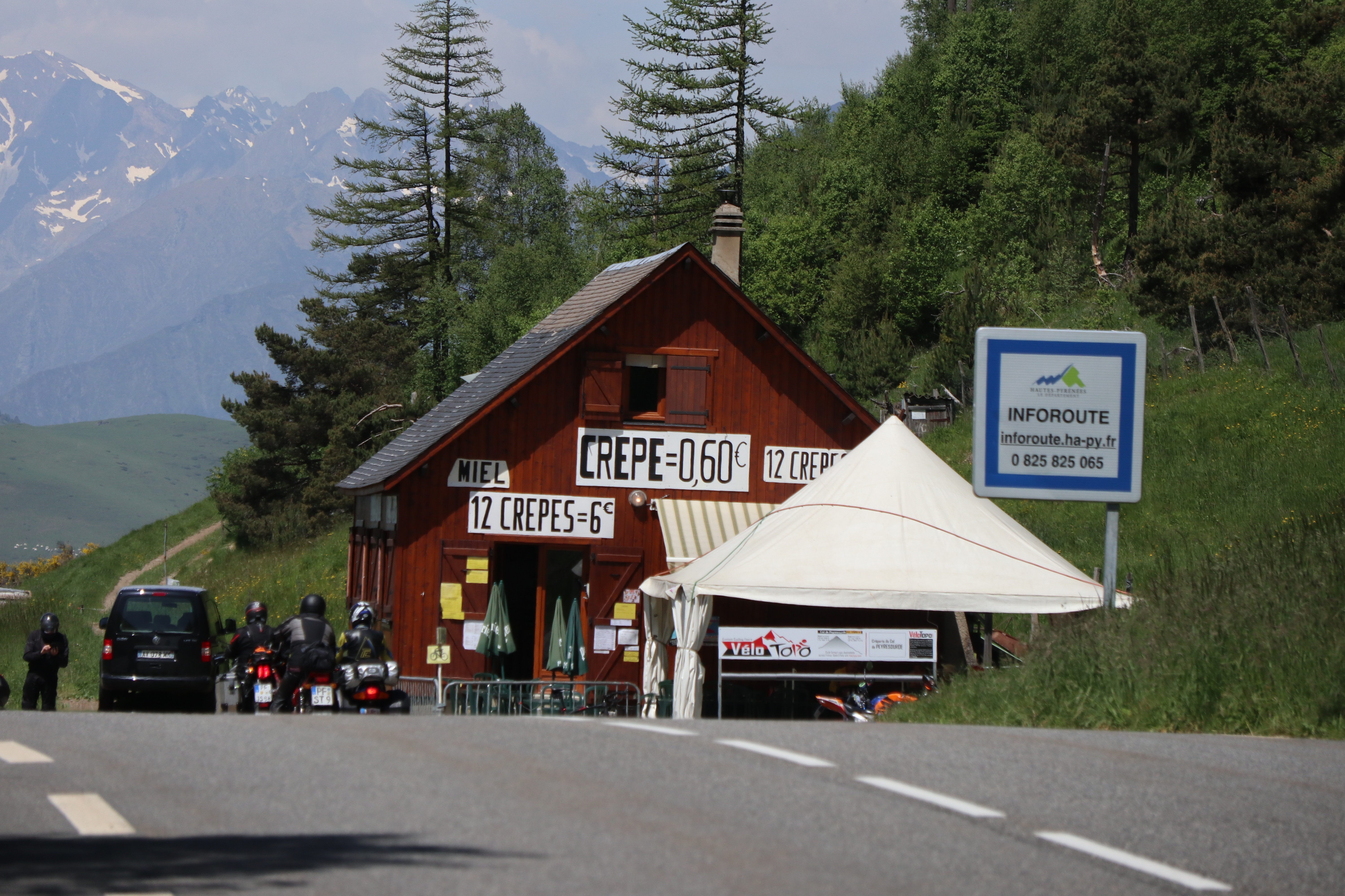 Der Col de Peyresourde gehört zu den eher unauffälligen Pyrenäenpässen. Das liegt zum einen daran, dass er recht stark frequentiert wird und zum anderen, dass sich die fahrerischen Herausforderungen auf der über den Pass führenden D 618 in Grenzen halten. Die Ostrampe präsentiert sich von Bagnères-de-Luchon zunächst nur leicht kurvig, dafür aber aussichtsreich am Hang entlang bergauf. Kurz vor der Passhöhe gibt es aber zumindest ein paar Kehren. Die 1.569 Meter hohe Passhöhe selbst ist unscheinbar, bietet aber zumindest mit Crêpes & Miel eine ansprechende Gastronomie, die sich in einer kleinen Holzhütte verbirgt. Die anschließende Westrampe ist ebenfalls bestenfalls überschaubar kurvig. |