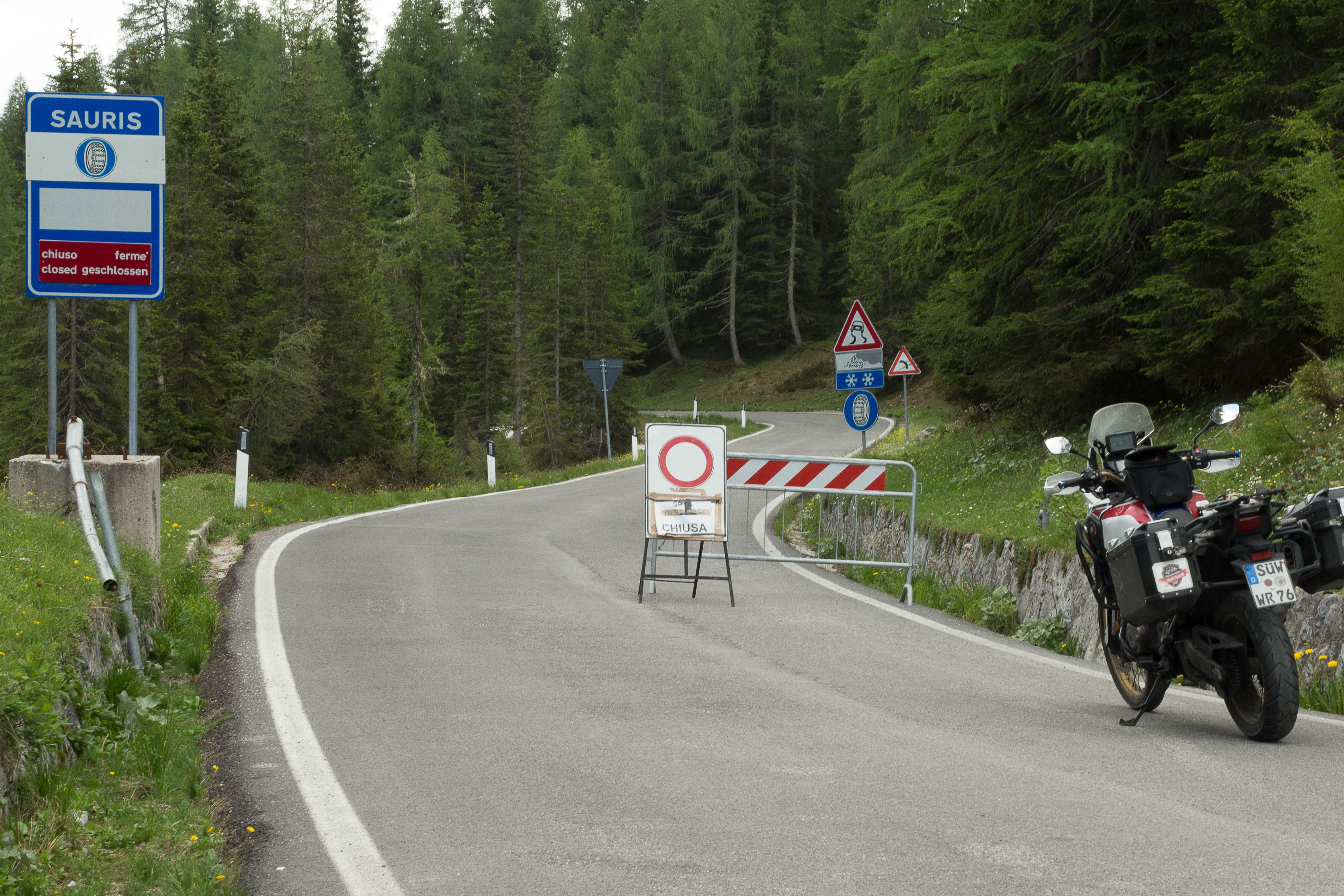 Zur Zeit ist die Anfahrt von Sauris aus gesperrt. Am Wochenende kann man aber vom Sella di Razzo bis zum Passchild fahren, trotz Absperrung