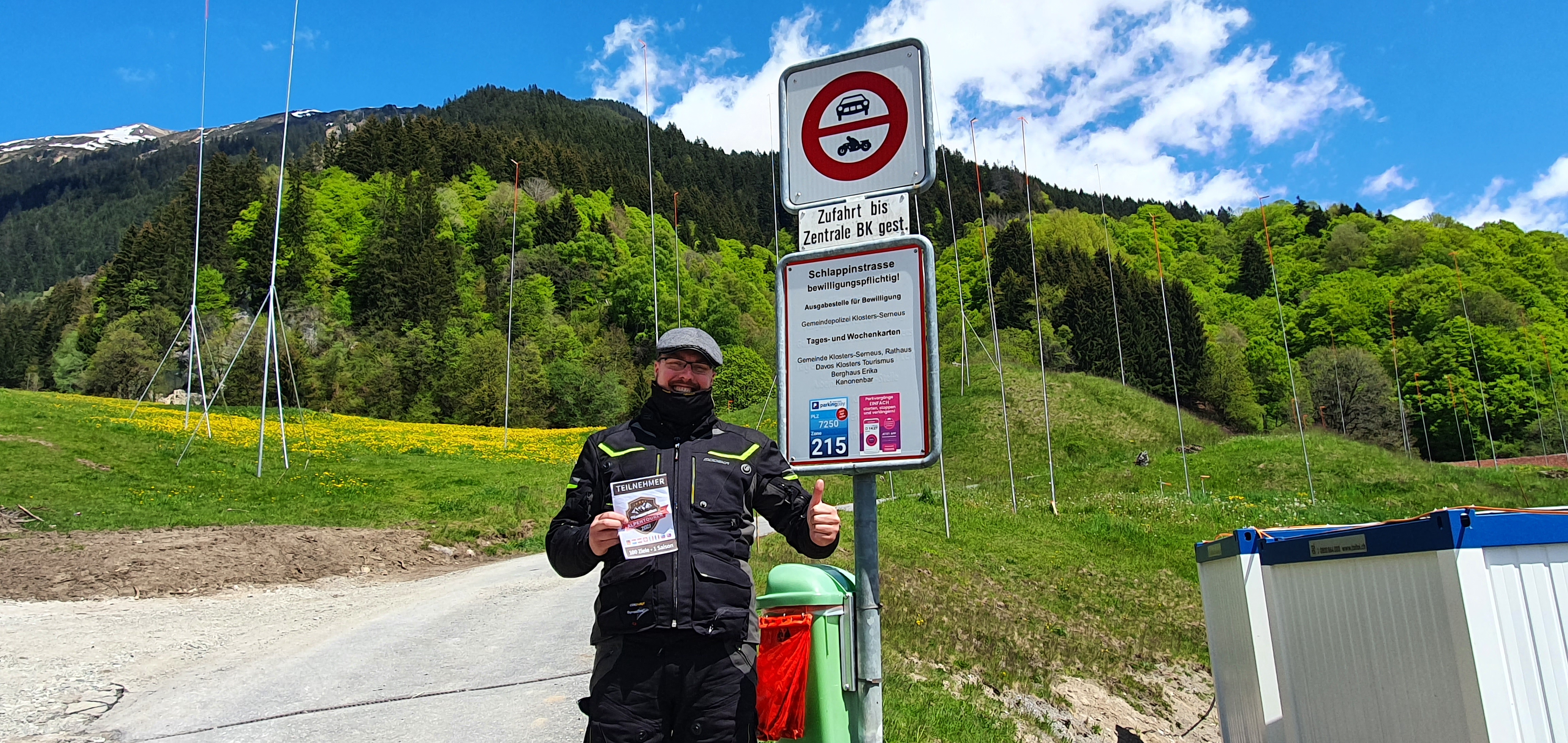 Nachtrag: Vom zweiten Fahrverbot sollte man sich nicht abhalten lassen. Dies scheint eine Art Haftungsausschluss (wie in Italien) zu sein. Oben beim Berggasthof Erika sollte man das Mautticket (CHF 10,-- bzw. auch Eur 10,--) kaufen, dieses gilt für die Auf- und Abfahrt. Die beim Gasthof weiterführende Schotterstraße ist gesperrt und darf nicht befahren werden (außer von Einheimischen, die spezielle Bewilligungen haben). Ich habe mich im Gasthof diesbezüglich erkundigt, weil wir diese Straße gerne gefahren wären.