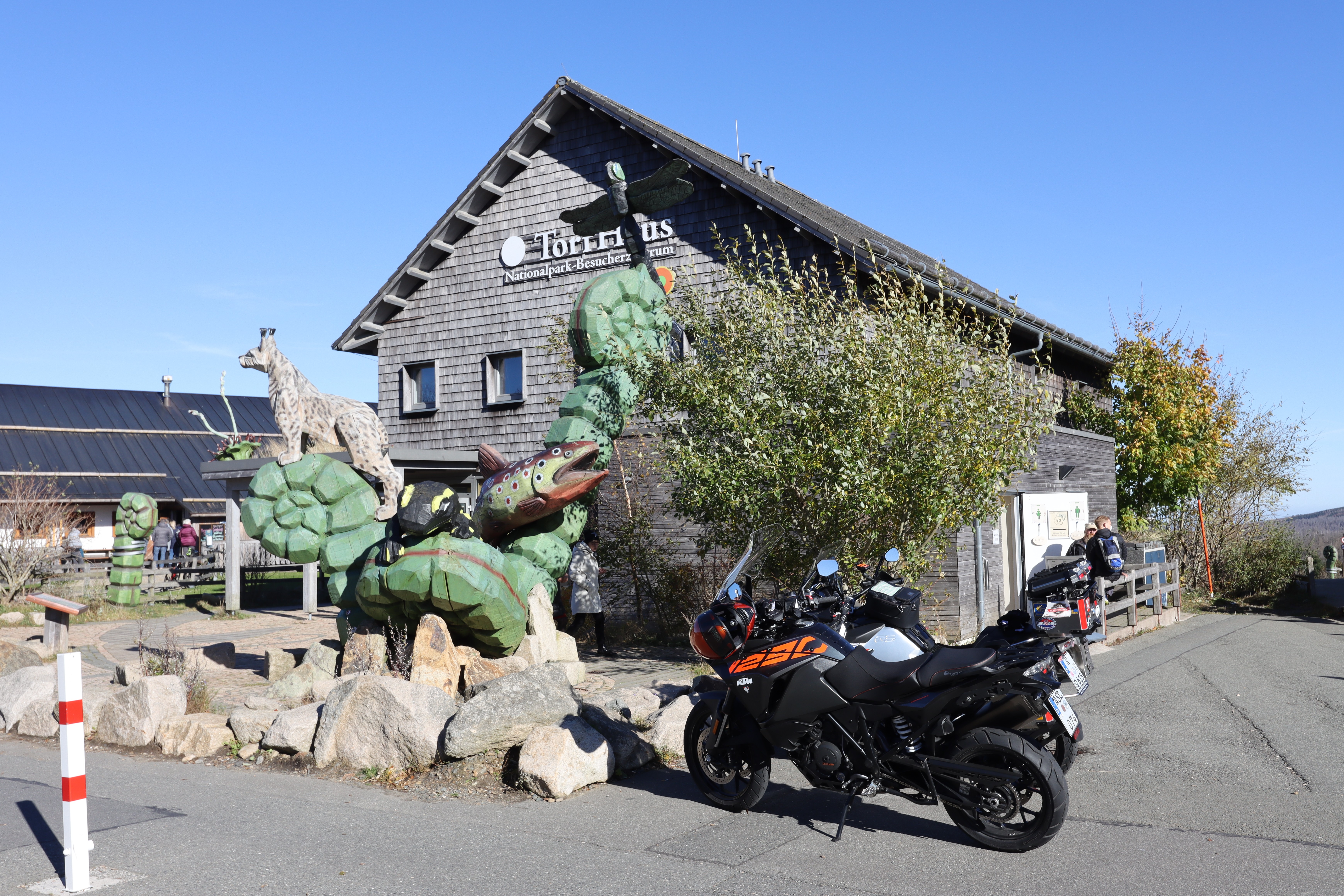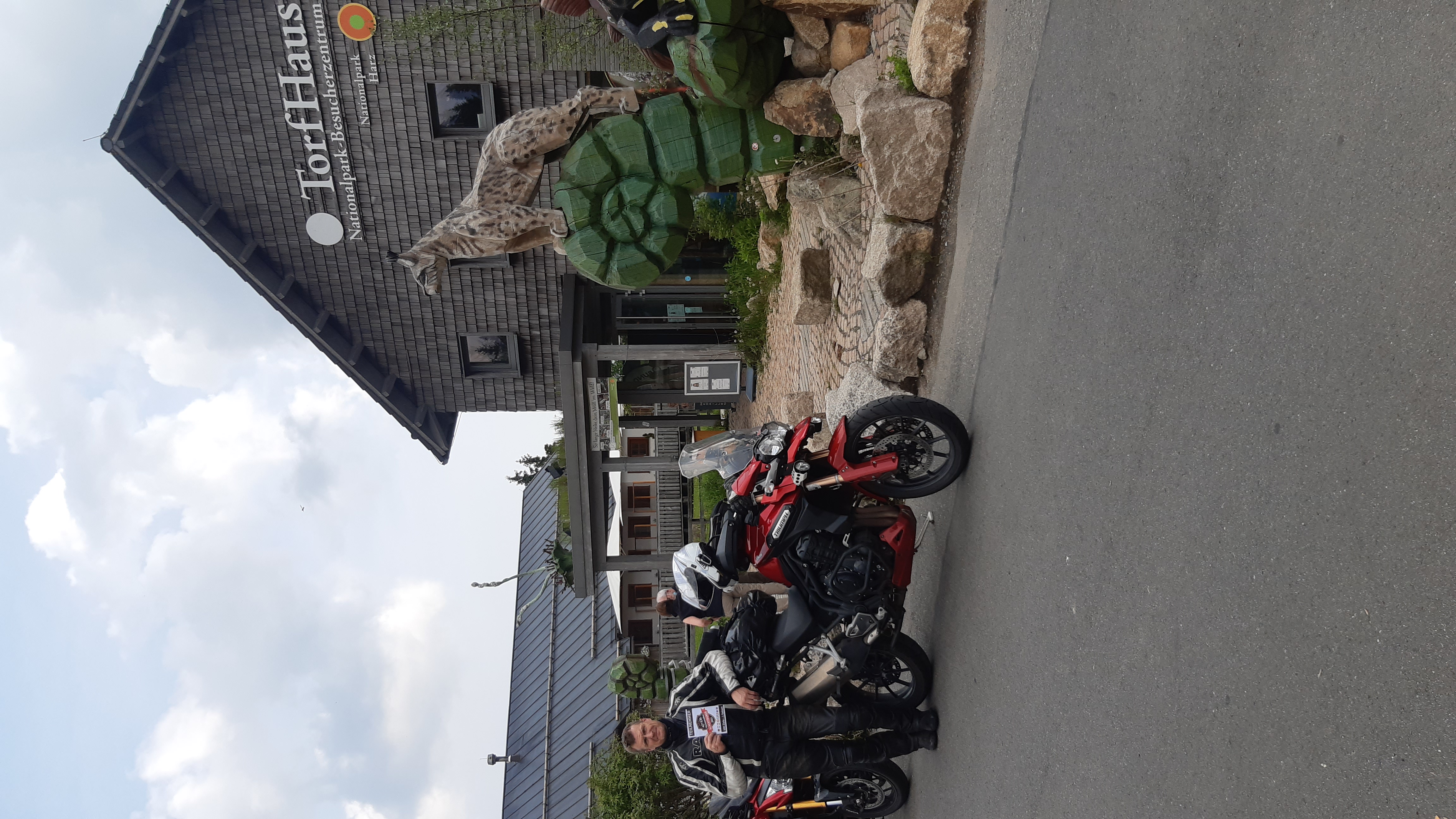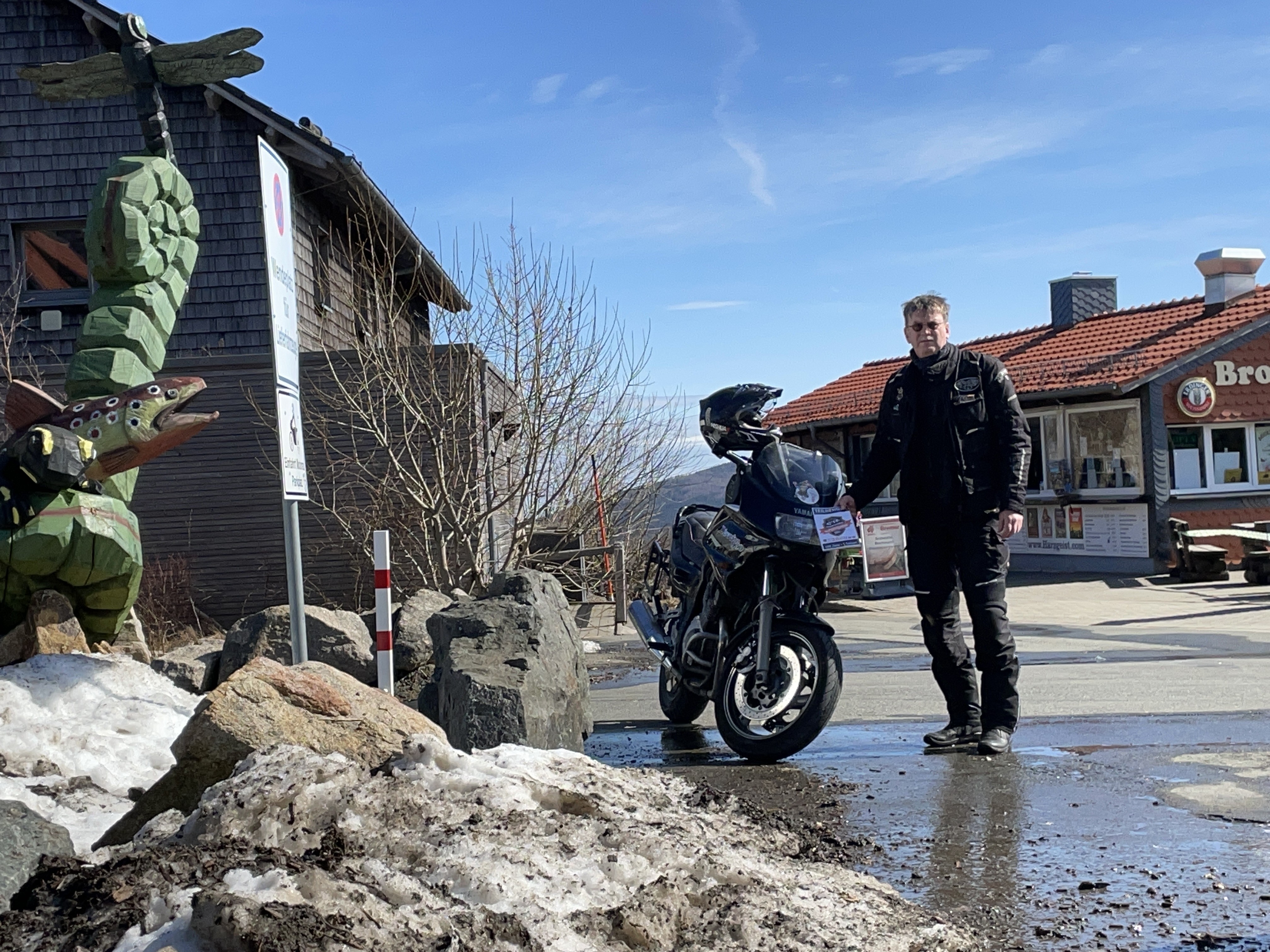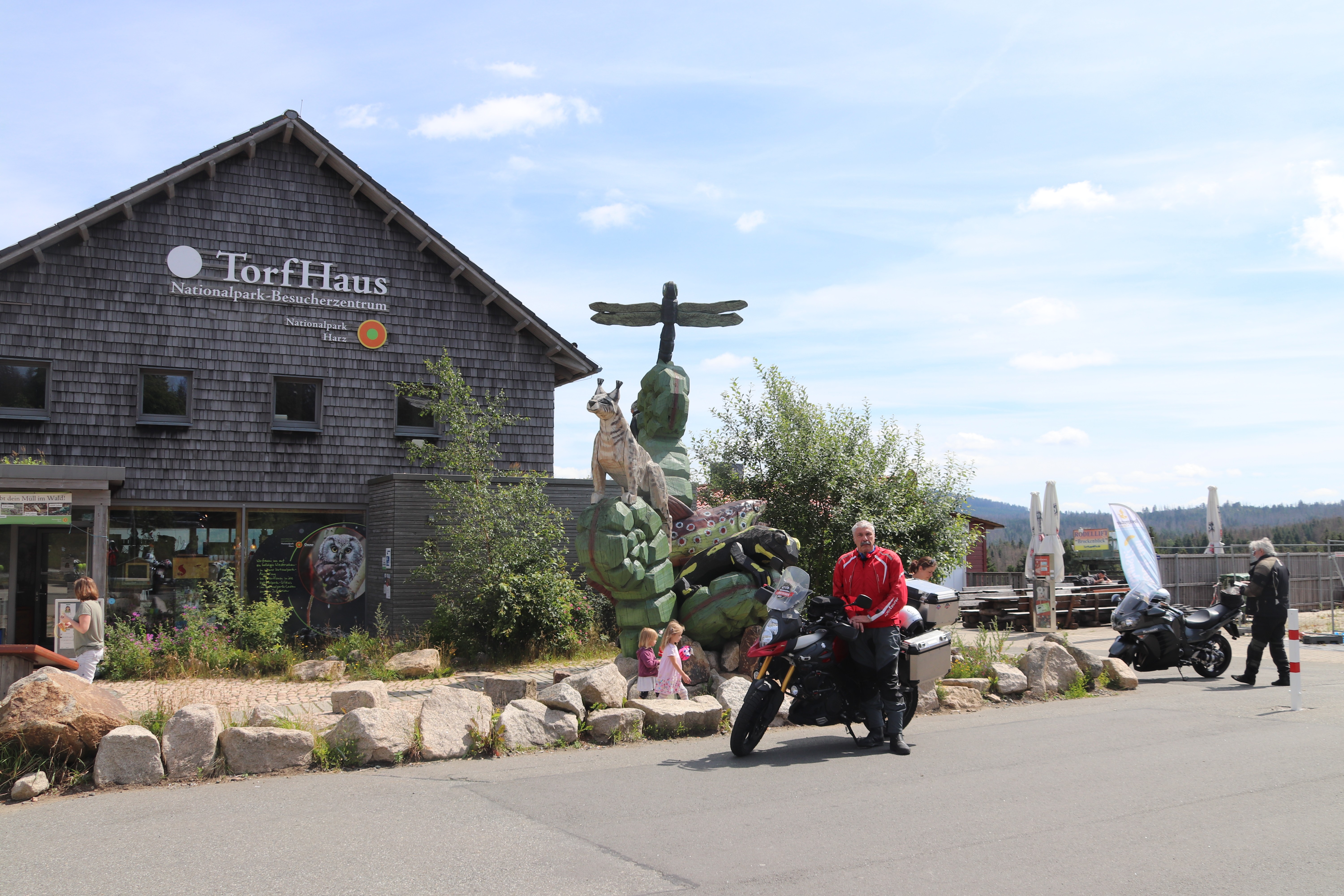 Der Aussichtspunkt Torfhaus erfreut sich vor allem an Wochenenden großer Beliebtheit. Hier hat sich ein Bikertreff etabliert. Allerdings liegt der Punkt unmittelbar an der recht stark befahrenen B4, die Braunlage mit Bad Harzburg verbindet. Wir empfehlen daher die deutlich entspanntere Anfahrt ab Altenau über die L504. Auf knapp über 800 Metern, dem höchsten anfahrbaren Punkt im Harz westlich vom Brocken, ist die Fernsicht auf den zentralen Gipfel dieses Mittelgebirges recht gut. |