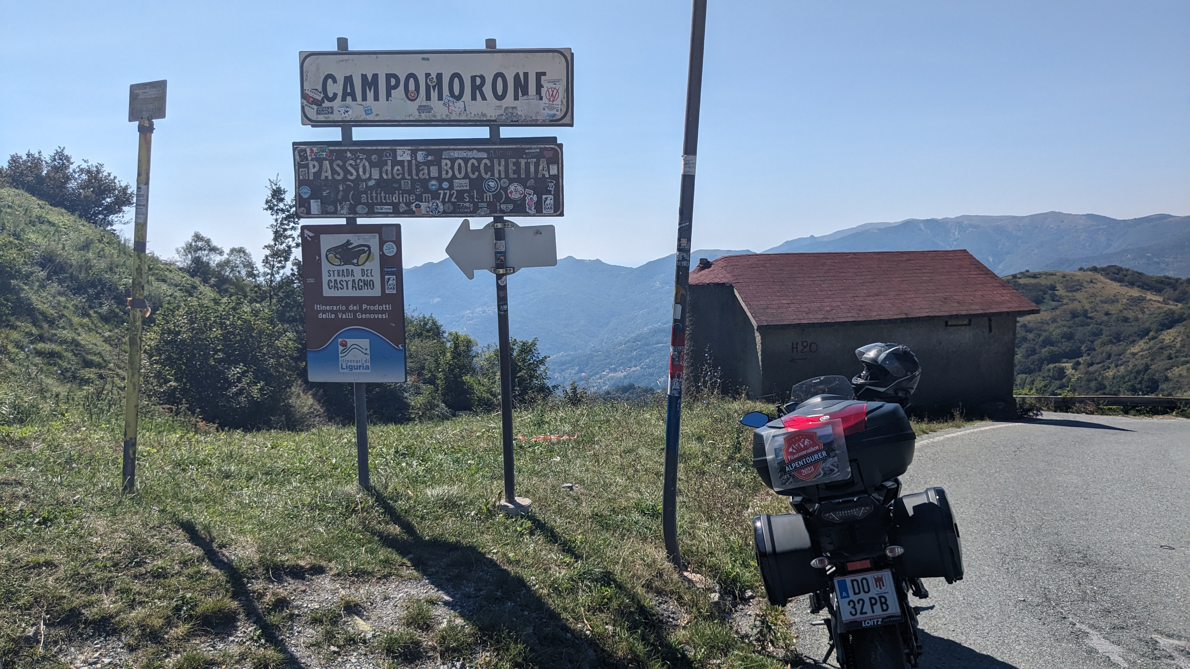 Der Passo della Bocchetta im ligurischen Apennin ist mit seiner Höhe von nicht einmal ganz 800 Metern zwar verhältnismäßig niedrig, die zugehörige Passstraße für Motorradfahrer aber dennoch ziemlich spaßig. Vor allem die in Campomorone beginnende Südrampe ist sehr kurvig und steigt mit einer Maximalsteigung von 18 Prozent auch sehr steil an. Außerdem sind teils enge Kehren zu meistern. Wir empfehlen daher auch, die Straße von Süd nach Nord und nicht andersherum zu fahren, da es von der Passhöhe eher gemächlich und unspektakulär weiter bis nach Voltaggio geht. Die Passhöhe selbst ist optisch zwar eher unscheinbar, bietet aber schöne Aussichten bis zur Küste, eine Schutzhütte mit Feuerstelle und ein Denkmal für das jährlich stattfindende italienische Radrennen Giro dell‘Appennino. |