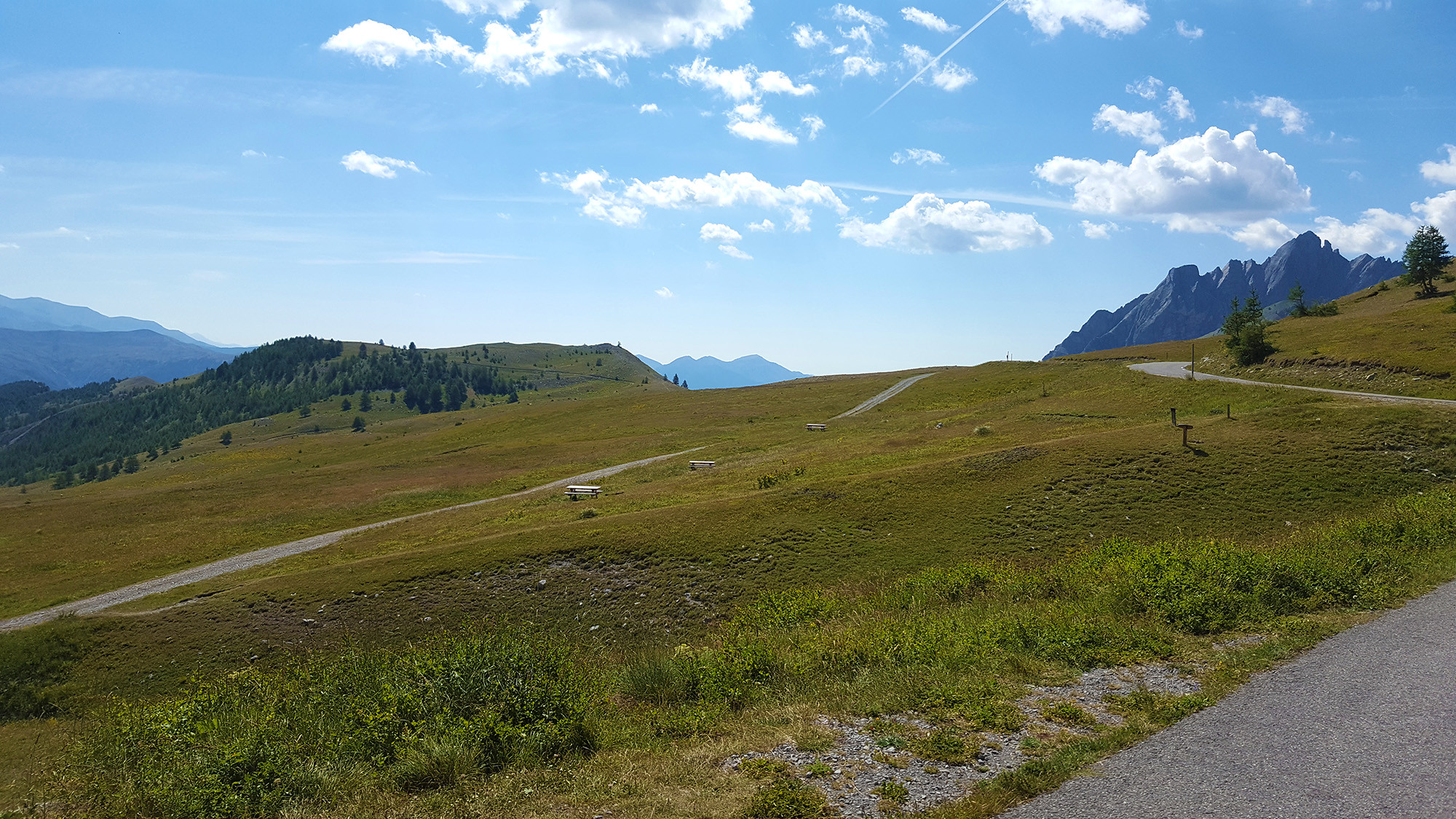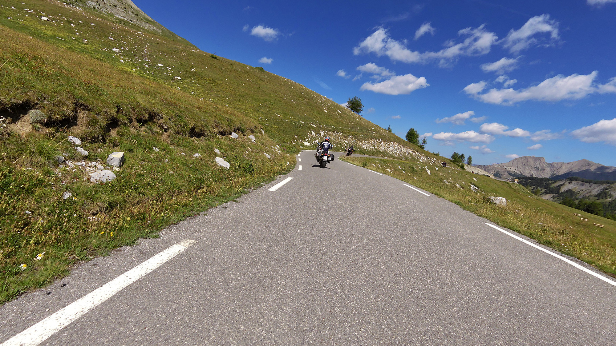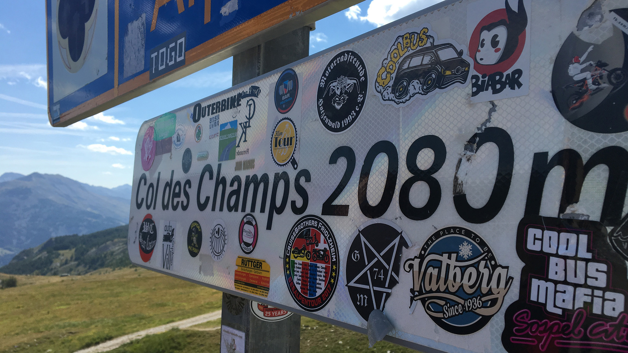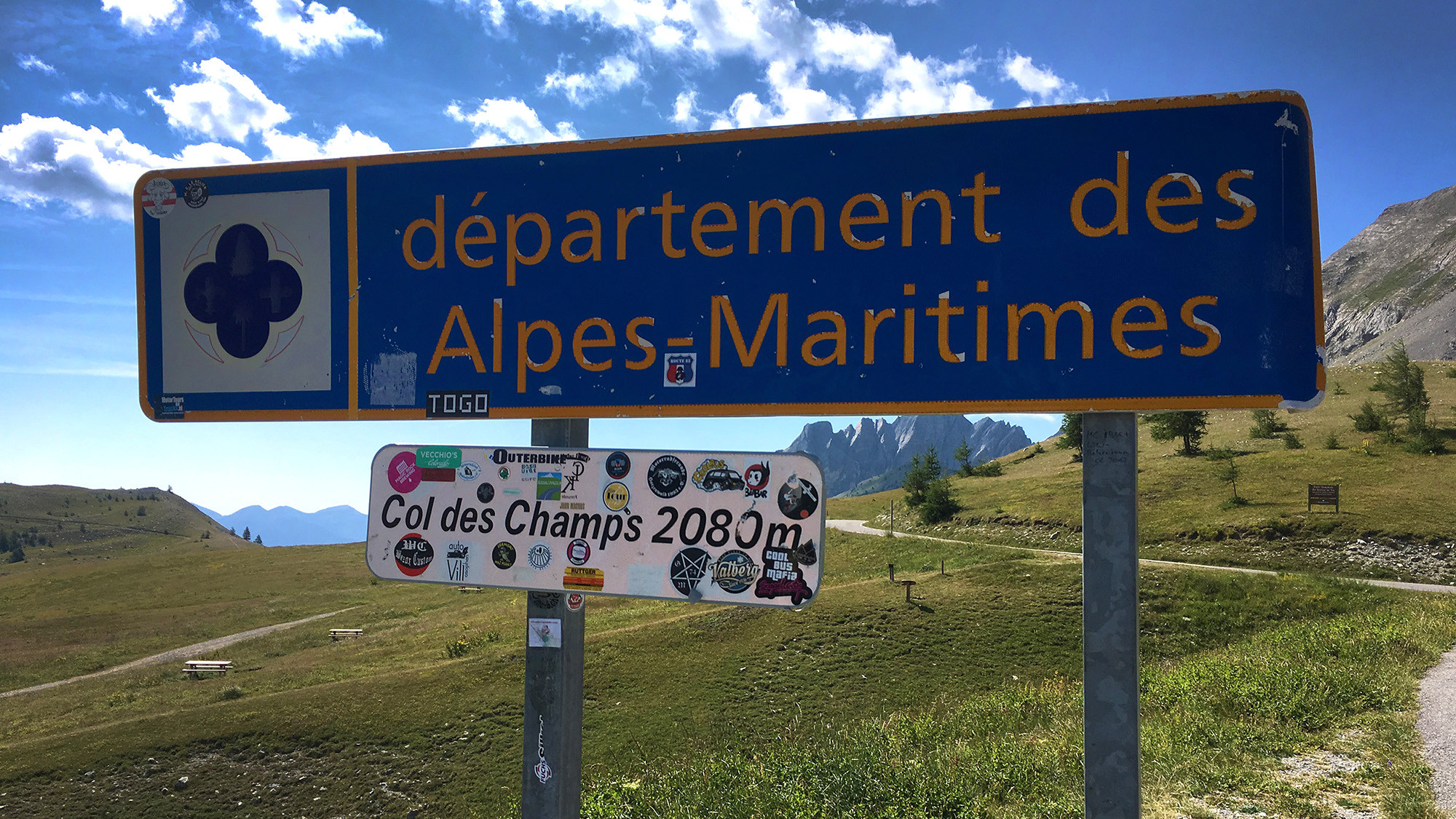Der Col des Champs lässt sich ganz hervorragend mit dem Col d'Allos kombinieren, da beide in Colmars, mitten in den Seealpen gelegen, starten. Von Colmars aus geht es über 28 wundervoll kurvenreiche Kilometer nach St-Martin-d'Entraunes. Wie schon der Allos ist auch der Col des Champs für Fahrzeuge über 3,5 t und 7 m gesperrt. Vorsicht ist auf der Westrampe (D2) geboten, da diese auf fast der gesamten Strecke nur einspurig befahrbar ist. Bei Gegenverkehr hilft hier nur ganz rechts an den Rand zu fahren und stehen zu bleiben. Hinzu kommen tiefe Wasserrinnen, Bodenwellen und sogar das eine oder andere Schlagloch. Auch größere Straßenschäden sind nach jedem Winter vorzufinden. Wegen der nur mäßigen regionalen Bedeutung der Strecke werden diese nicht selten spät sund nur notdürftig geflickt. Dafür ist die Ostrampe (D78) ganz gut in Schuss und bietet Fahrvergnügen pur. Die Passhöhe befindet sich auf 2.087 Metern. Sie ist zugleich die Grenze zwischen den Départements Alpes-de-Haute-Provence und Alpes Maritimes. Lange verweilen muss man dort allerdings nicht, da keine Infrastruktur vorhanden ist. Nicht einmal ein kleines Wirtshaus hat sich dorthin verirrt. |