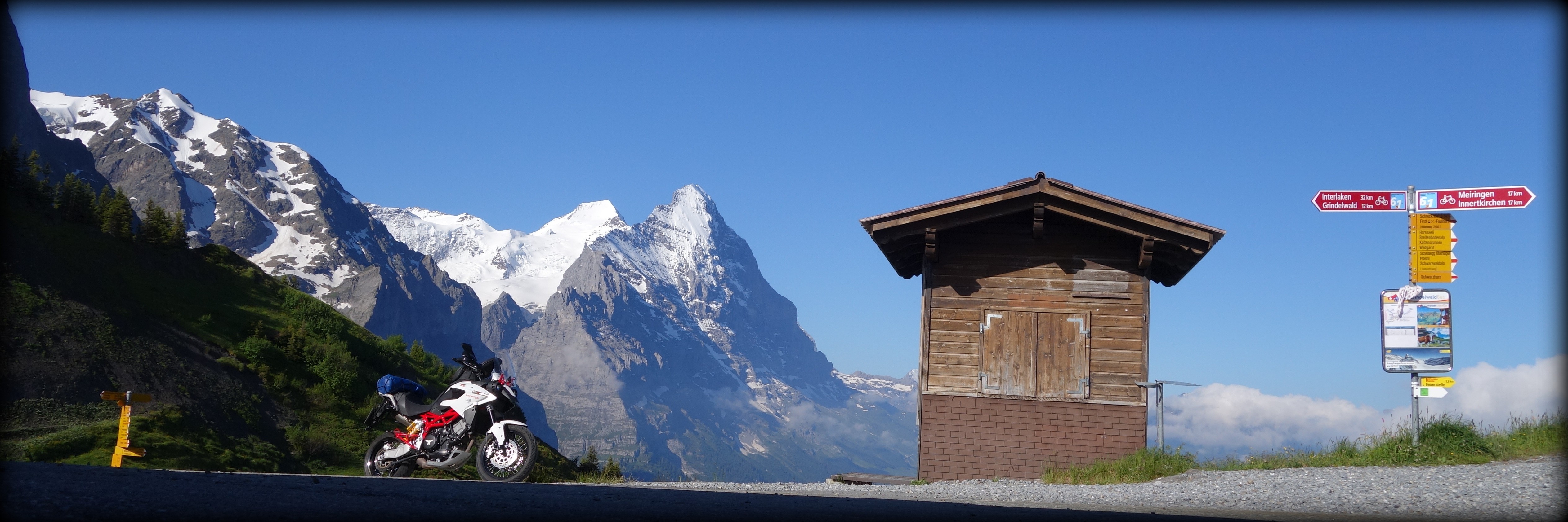 Seit 1979 besteht eine knapp 30 Kilometer lange, durchgehende Verbindung von Meiringen bis nach Grindelwald, die am grandiosen Panorama der Eiger-Nordwand vorbeiführt. Zwischen Grindelwald und Schwarzwaldalp besteht allerdings für jeglichen motorisierten Individualverkehr ein striktes Fahrverbot. Eine Bewilligung zur Befahrung erhält aber, wer im Berghotel Grosse Scheidegg als Gast übernachtet. Die Strecke, die zu den schönsten Bergstraßen der Schweiz zählt, ist es ebenso wert, wie das großartige Panorama mit zahlreichen Drei- und sogar einigen Viertausendern. Diese Gipfel umschließen auch ein ausgedehntes Gletschergebiet. An der Nordostrampe nach Meiringen befindet sich etwa auf halber Strecke der Parkplatz Rosenlaui. Von dort aus lässt es sich gut in die gleichnamige Gletscherschlucht oder zum Gletscherblick wandern, ein beeindruckendes Naturerlebnis. |