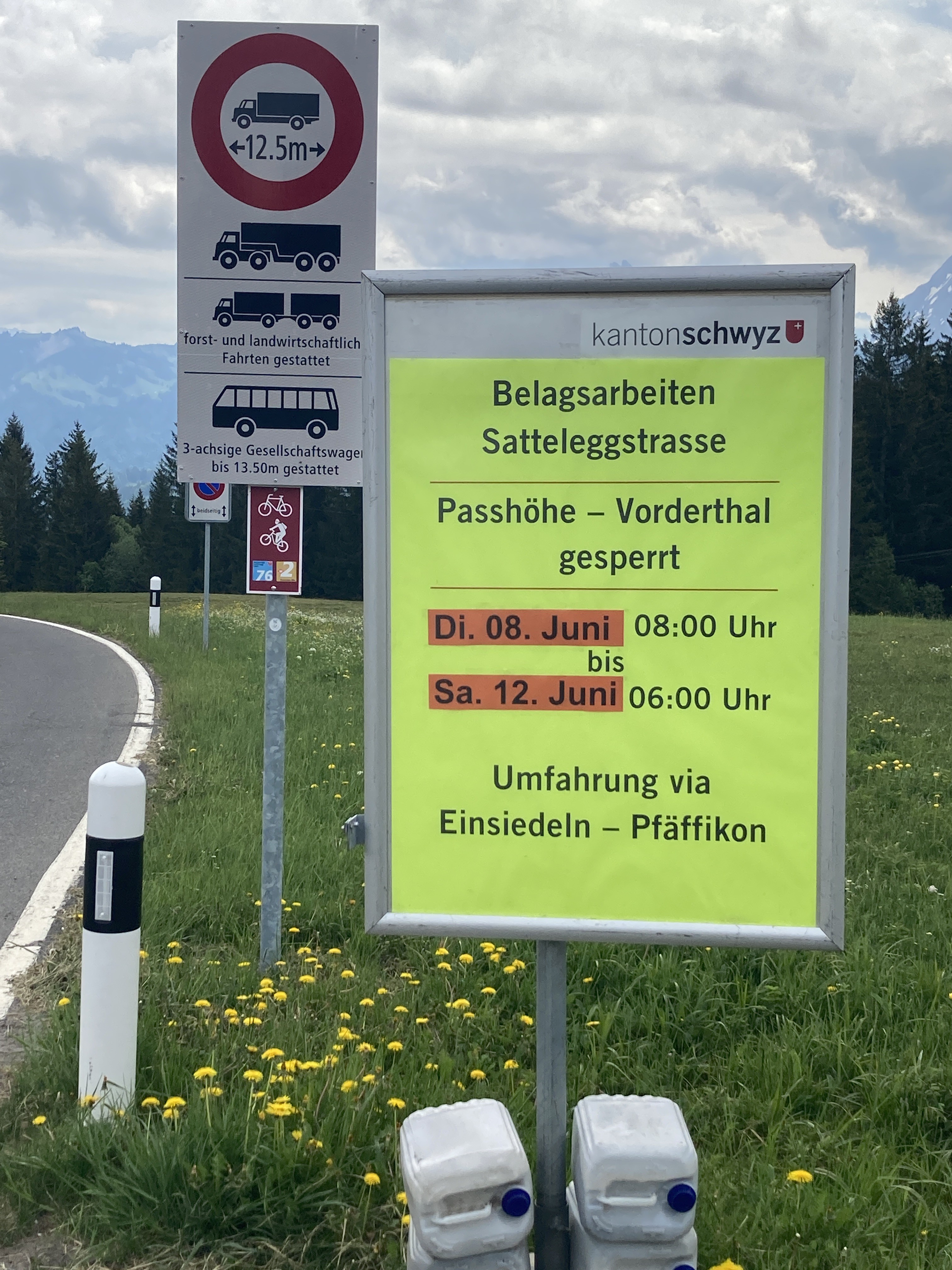 Sattelegg vom 08. bis 12.06.21 gesperrt, siehe Foto.