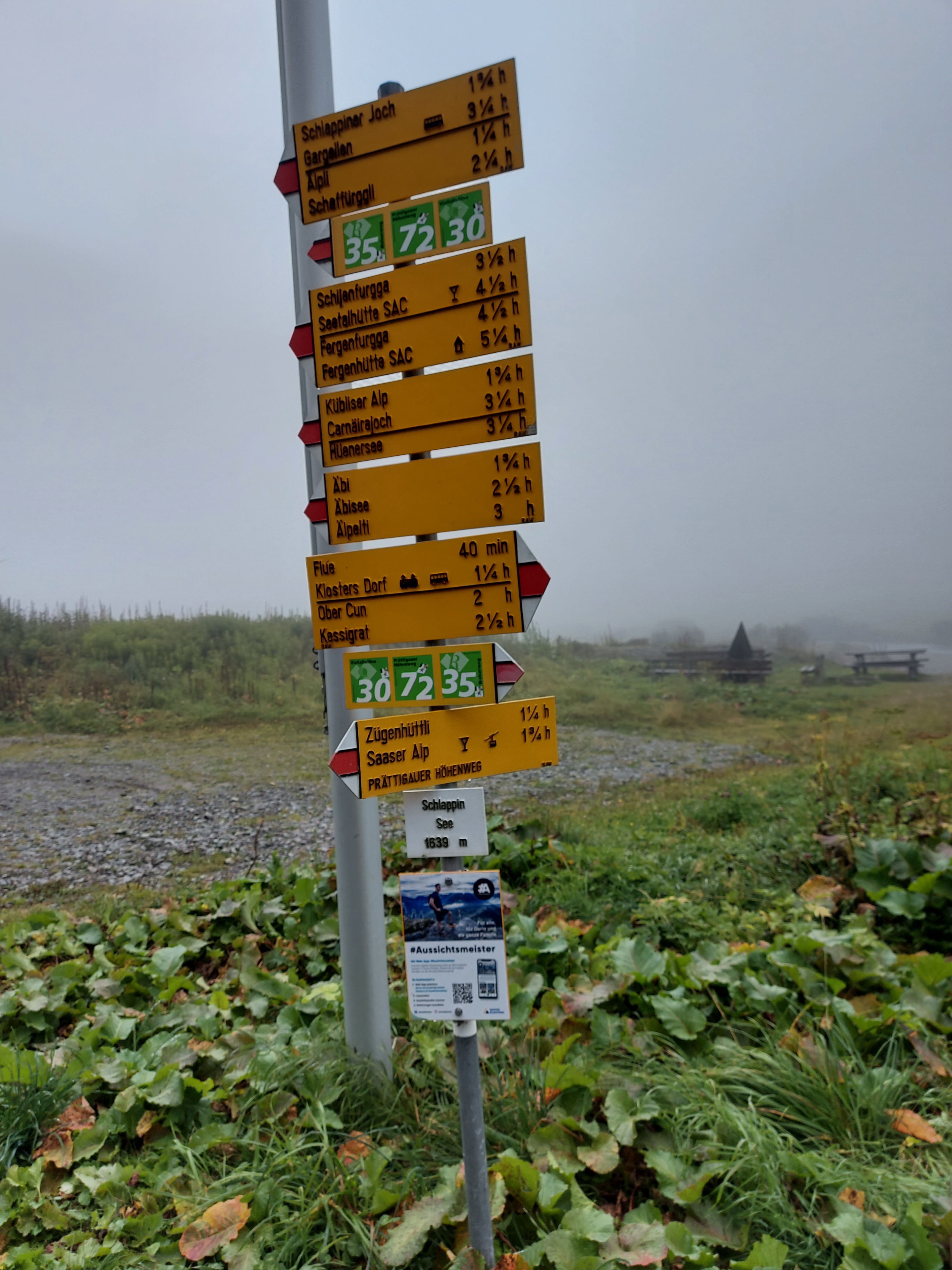 Der Weg ins Schlappintal zweigt in Klosters Dorf nach Nordosten ab. Mit einigen Kehren überwindet die bis hierher noch asphaltierte Straße eine erste Stufe. Wo der Asphalt endet folgt der Weg nun mit Steigungen bis zu 30% dem Schlappinbach bis zu der alten Walsersiedlung. Zum Abschluss passiert man einen kleinen Stausee. Die Befahrung der Strecke ist mautpflichtig und kostet 10 CHF. Die Maut ist 24 Stunden gültig, erhältlich vor Ort (also nach der Anfahrt) im Berghaus Erika in Schlappin gleich beim See. Das sehenswerte Walserdorf markiert die Baumgrenze wie auch den Punkt, an dem das Tal nach Südosten abschwenkt. Ein unbefestigter Fahrweg führt zwar noch weiter durch das hochalpine Tal bis auf gut 2.024 Meter. Hier besteht aber ein Fahrverbot für Kfz. |