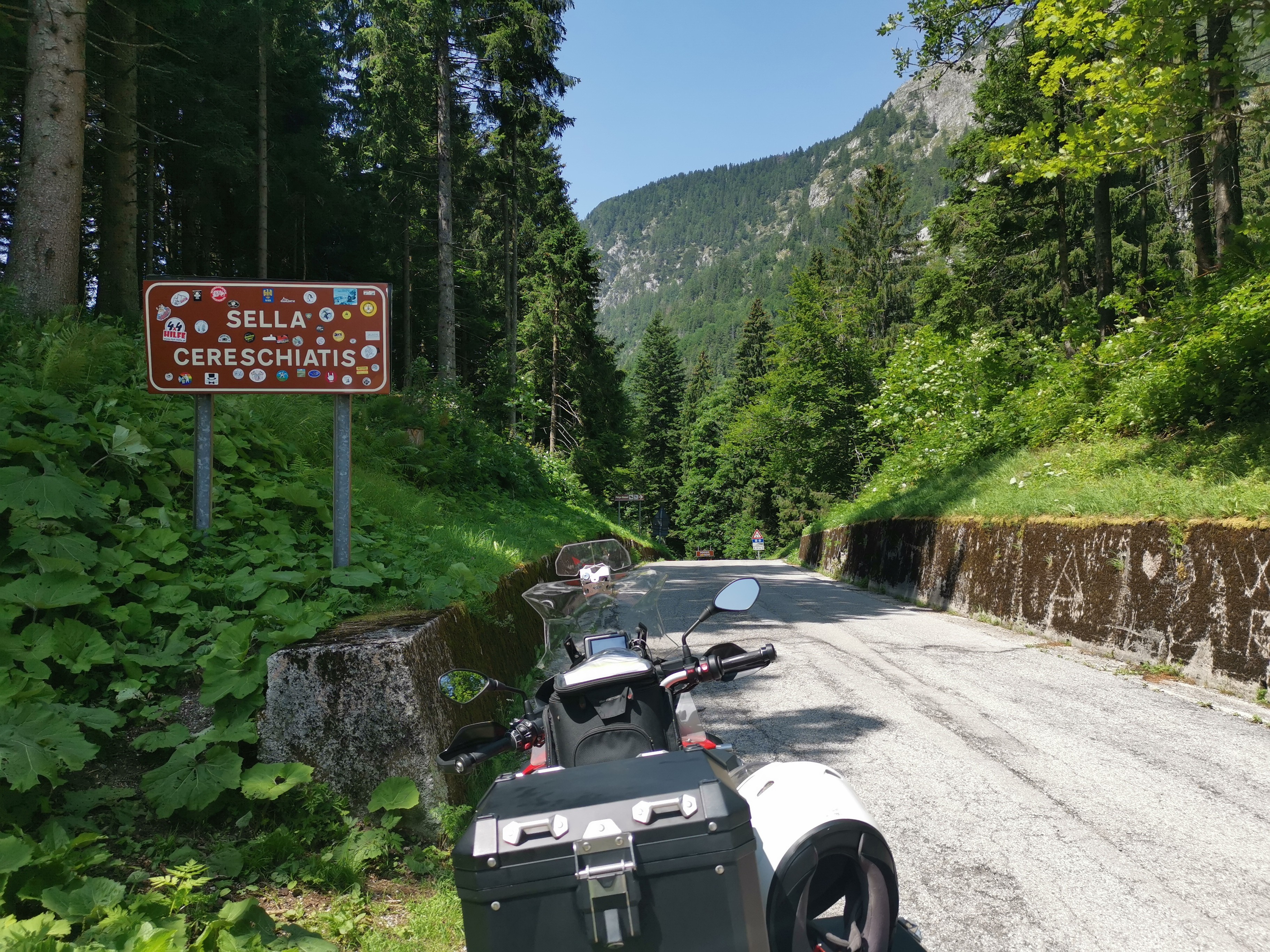 Im nördlichen Friaul und Grenzbereich der Julischen und Karnischen Alpen findet sich unweit der Autobahn sowie der Eisenbahnstrecke Villach-Udine direkt an der Mündung des Aupatals in das Eisental die kleine Gemeinde Moggio Udinese. Sie ist aufgrund ihrer sehenswerten Fella-Brücke und der Abtei San Gallo einen kurzen Bummel wert, bevor es auf die Südrampe der als SP12 ausgewiesenen Passstraße geht. Das erste Teilstück zeigt sich mit moderaten Steigungen und recht wenigen Steigungen zunächst noch wenig imposant. Dafür ist es schön zu fahren, da die Strecke entlang eines hübschen Baches verläuft und der Asphalt erst vor wenigen Jahren modernisiert wurde. Erst kurz vor dem Pass – etwa ab Kilometer 15 – gilt es die Maximalsteigung von 15 % auf einigen schnell aufeinander folgenden Kehren zu meistern. Eine längere Pause lohnt sich am Scheitel nicht, da er sich mitten im Wald befindet. Stattdessen geht es geradewegs weiter nur Norden, wo man mit schönen Kurven, einigen engen Kehren, einer kurzen Fahrt durch einen Tunnel und vor allem tollen Ausblicken auf das darunter liegende Kanaltal (italienisch: Val Canale) sowie zum Monte Cavallo belohnt wird. |