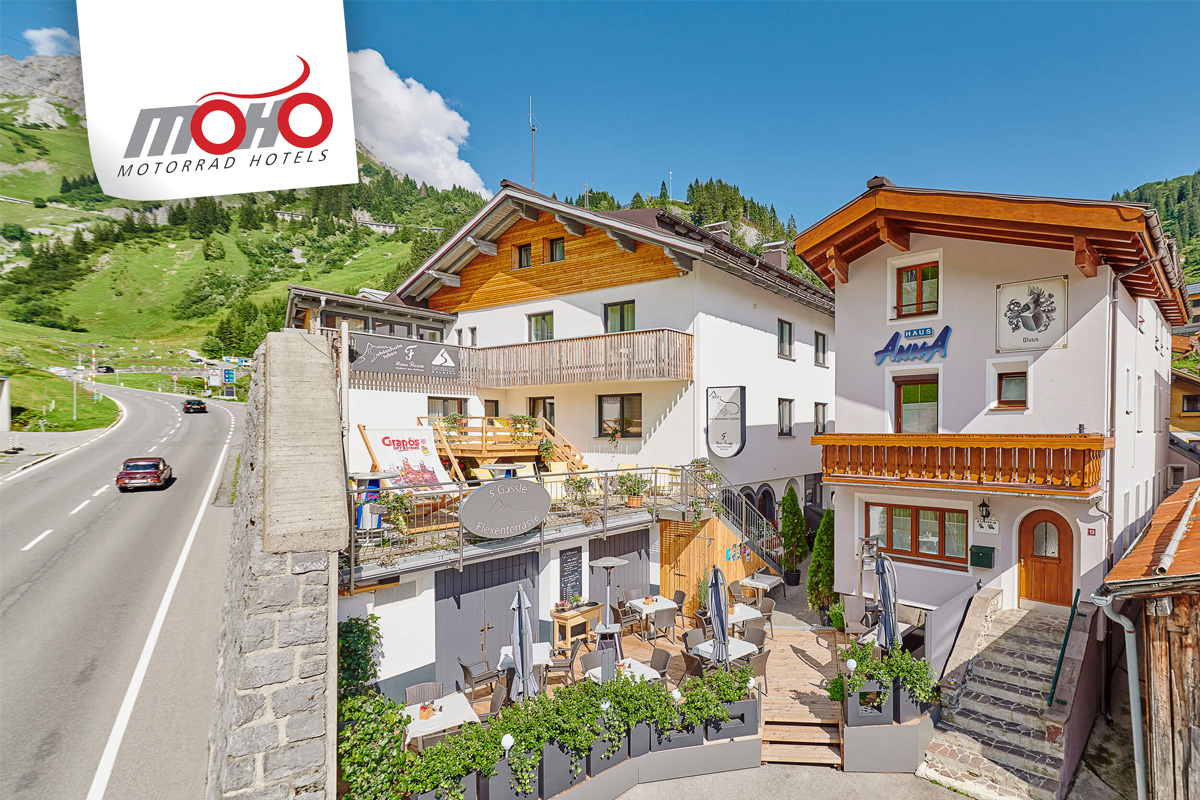 Die lebendige Motorradkultur des Haus Flexen im kleinen Bergdorf Stuben am Arlberg macht aus der Pension im Dorfkern die ideale Wohlfühl-Bleibe für Freunde der Schräglage. Und natürlich auch die hochalpine Bergstraße direkt vor der Haustüre: der berühmte Arlbergpass. Die Motorradleidenschaft wurde Gas(t)geber Willi von Willi Senior quasi in die Wiege gelegt. Und da man von der PS-Liebe allein noch nicht satt wird, verwöhnt Willi seine Gäste nicht nur mit persönlicher Tourenplanung, sondern abends auch mit Vorarlberger Spezialitäten und ofenfrischer Pizza. Zum Tagesabschluss werden in Willi’s Pub die abgespulten Kilometer dann ausgiebig besprochen. Die Meisten der mit Holz hochwertig eingerichteten Zimmer, bieten traumhafte Ausblicke auf die Hausberge Erzberg, Albona und Burtscherkopf. Da macht das Aufstehen Spaß! Motorradurlaub am ArlbergAm Fuße des Arlbergs gelegen, bieten sich vom Haus Flexen aus, traumhafte Tagestouren im Dreiländereck Österreich – Schweiz – Deutschland an. Wie etwa über die Serpentinen der Flexenstraße und den Flexenpass Richtung Lech – Warth, weiter über den Hochtannbergpass und den Furkapass ins Laternsertal. Zwischen Arlberg und Bodensee findet man zudem die am besten erhaltene Alp- und Talsennerei-Struktur Österreichs. |